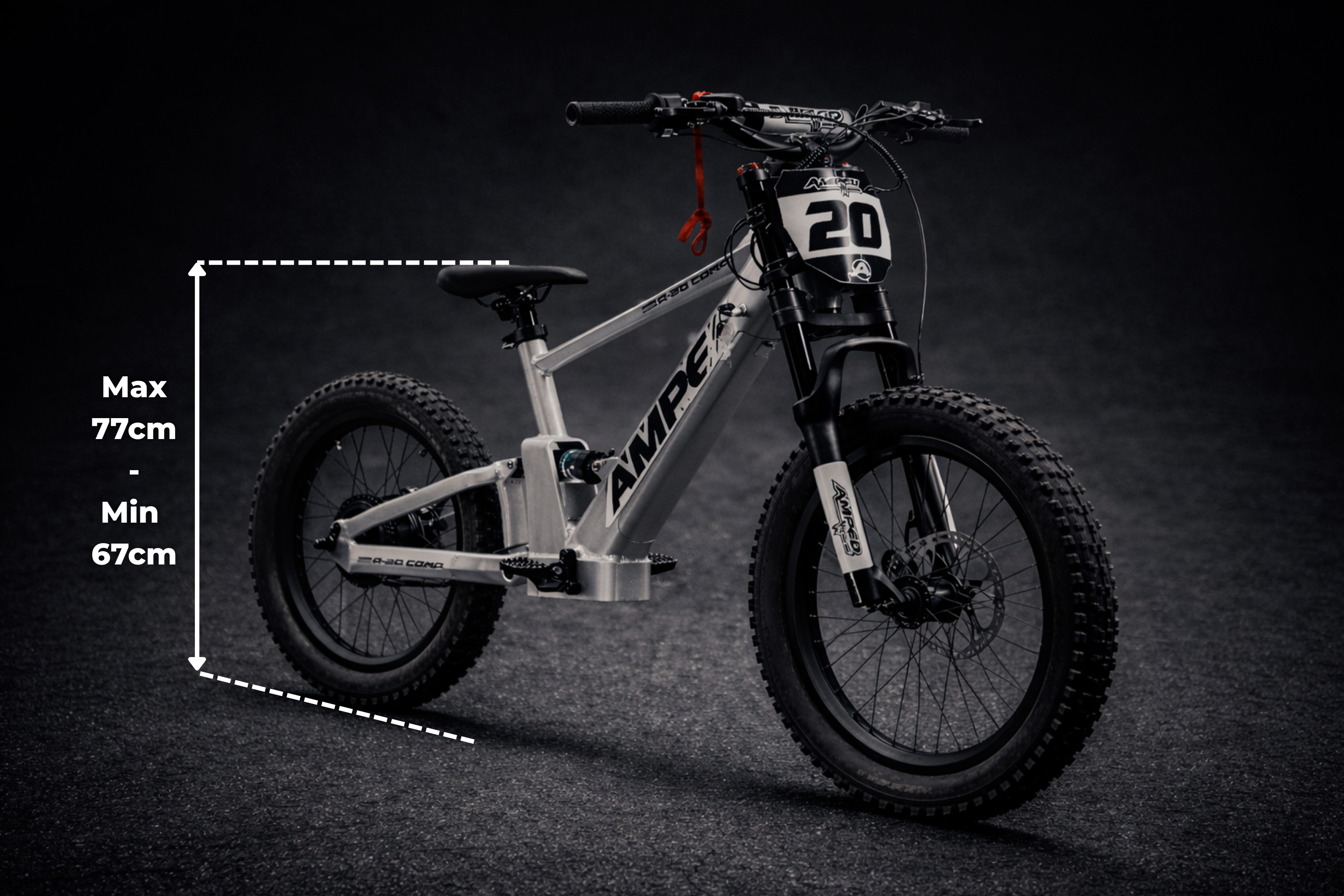The Amped A20 Comp Electric Balance Bike is designed with carefully considered performence based dimensions to ensure a comfortable and confidence-building fit for young riders wanting to take their riding to the next level, with an adjustable seat height ranging from 67cm to 77cm the bike suits children with an inside leg of 68cm so that both fit on the floor comfortably, parents can easily adjust the seat along with adjust the front and rear suspension to ensure the rider is comfortable while pushing the limits.