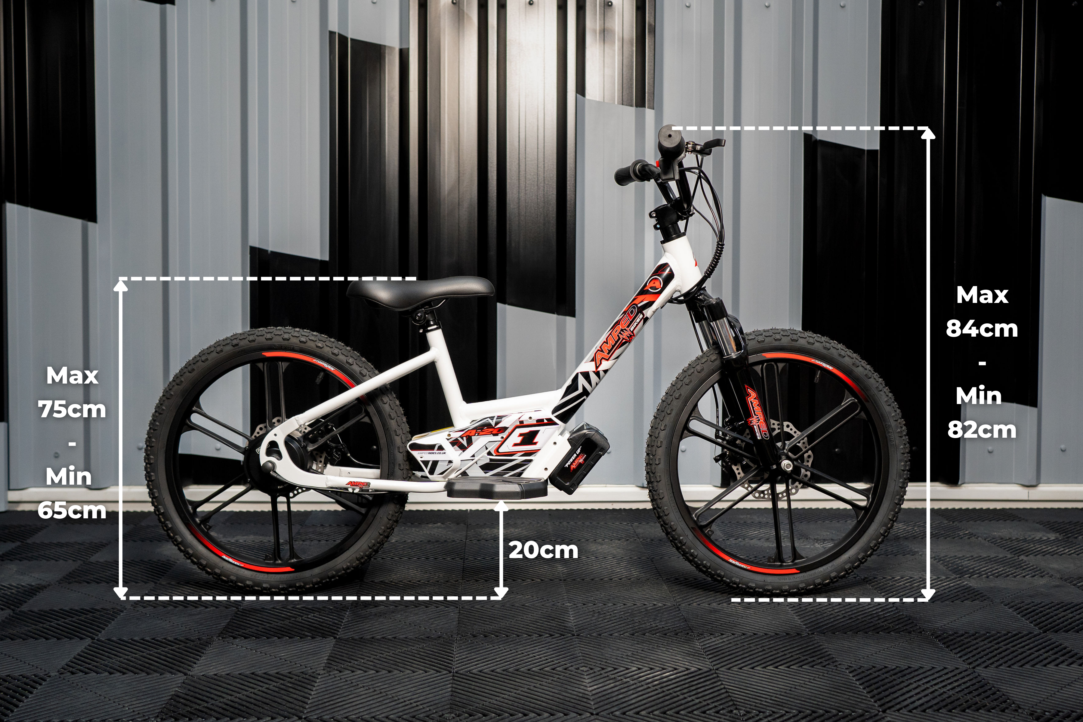 The Amped A20 Electric Balance Bike is designed with carefully considered dimensions to ensure a comfortable and confidence-building fit for young riders, with an adjustable seat height ranging from 65cm to 75cm the bike suits children with an inside leg of 65cm so that both fit on the floor comfortably, parents can easily adjust the seat and handlebar height to ensure the rider is comfortable.