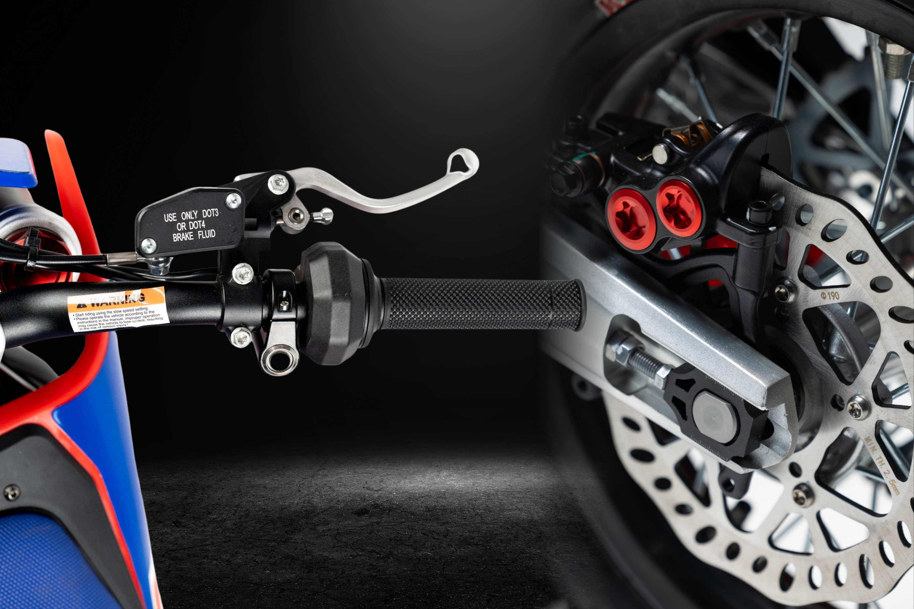 The RFN Warrior SX-E8 electric dirt bike is equipped with precision DOT4 hydraulic disc brakes, delivering powerful, reliable, and responsive stopping performance in all riding conditions. Designed for young riders who push their limits, this high-performance braking system is built to withstand off-road demands and has been tested under race conditions to ensure maximum control and safety. Whether tackling steep descents or navigating technical trails, the Warrior’s advanced disc brakes provide consistent braking power and confidence, making it one of the best youth electric motocross bikes for safety, control, and performance.
